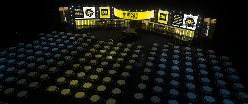 Super Machine and I worked alongside Tangible Vision to develop a graphics package for Dollar General’s 2022 Purpose Meeting. The project was to create renderings and a design thematic that would be appropriate for eleven screens, 140 ft. wide and 24 ft. tall. We employed a museum-style aesthetic, using designed glass panels, to display Dollar General’s history through key moments. The audience was taken through a tour of the company’s history through impactful visuals, which was emphasized by a “grand opening” perspective-shifting moment paired with transitions and pertinent branding.